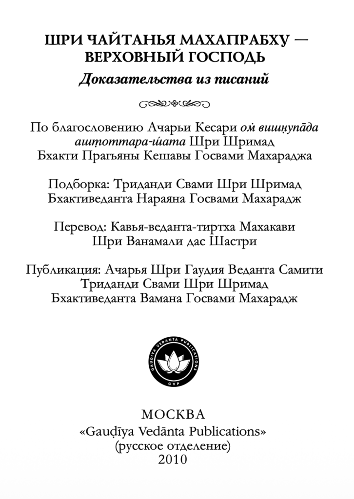 В 2010 году организация «Gauḍīya Vedānta Publications» (русское отделение) опубликовала книгу «Шри Чайтанья Махапрабху — Верховный Господь: Доказательства из Писаний». На странице 5 русские издатели пишут: