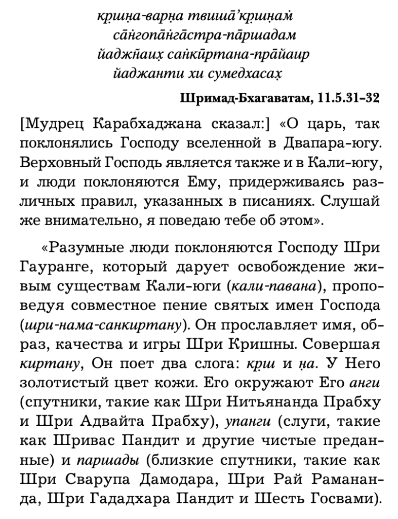 «В кали, светлые разумом почитают чёрного цвета Кришну санкиртаной, с его оружием и окружением».