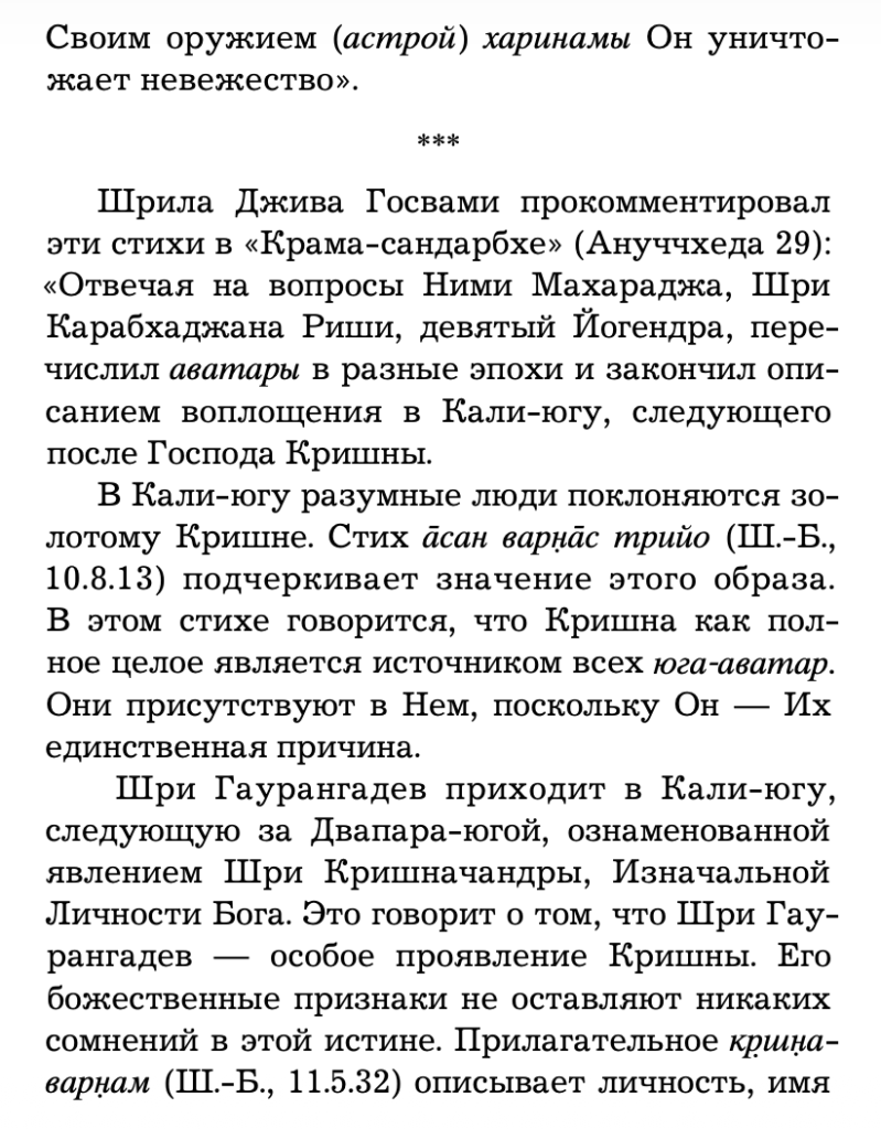 (цвет «кришна»)? В строфе 11.5.32 (о кали юге и кали юга аватаре) жёлто-золотой цвет не упоминается, однако, по мнению гаудия вайшнавов, кали юга аватарой является Чайтанья — золотая аватара. В строфе 10.8.13 Гарга говорит, что цвет Бхагавана в двапаре — «жёлто-золотой» («пита»). Вот и получается, что Чайтанья по цвету — двапара юга аватара, оказавшийся в тёмном веке кали. Понимая, что цветовая идея Дживы Госвами при детальном анализе не выдерживает